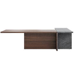 Mux70-skrivebordet er resultatet af foreningen af to forskellige elementer, som ideelt set danner et T, når de placeres ved siden af hinanden. Disse elementer spiller en vigtig rolle med hensyn til farvekombinationer og finish, hvilket muliggør maksimal kreativitet ved blanding af nuancer og materialer tilgængelige i kataloget, der spænder fra raffineret træ og matte lakker til fint læder og materialer som Fenix og Ecomalta.